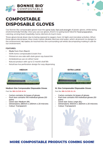 Plastic disposable gloves have been banned in many countries around the world. Our Bonnie Bio compostable gloves are a great alternative to plastic, making them an ideal and environmentally friendly replacement.