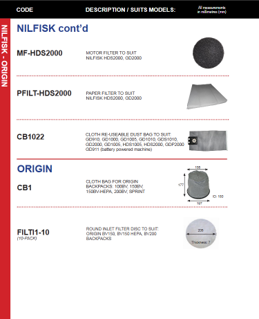 • Nilfisk: GD910, GD1000, GD1005, GD1010, GDS1010, GD2000, GD1005, HDS1005, HDS2000, GDP2000, GD911 (battery powered machine)