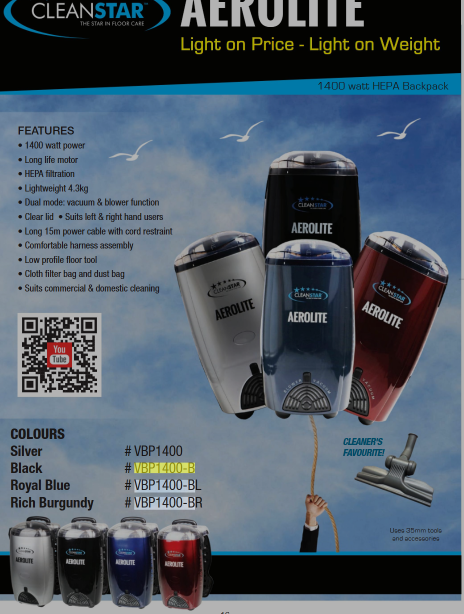 CLEANSTAR AEROLITE 1400 WATT BACKPACK-BLACK | Cleaning Products Australia Group Cleaning Products Australia