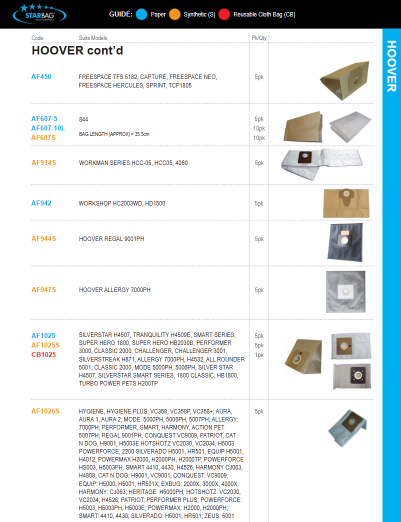 - Cleanstar Hoover Regal 9001PH Synthetic Vacuum Cleaner Dust Bags are high-quality replacement bags designed to deliver superior filtration and long-lasting performance. Made from durable multi-layer synthetic material, these Starbag dust bags effectively capture fine dust particles while maintaining strong airflow. Ideal for commercial and household use, they ensure hygienic cleaning and easy, mess-free disposal.