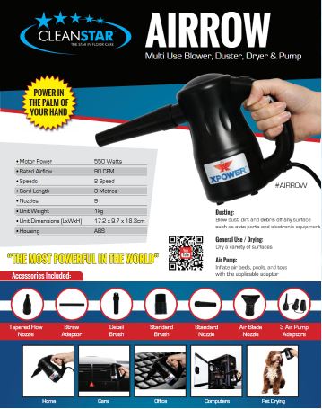 CLEANSTAR – XPOWER Airrow 240V Black is a compact, multi‑purpose handheld blower, duster, dryer and pump designed for cleaning and drying tasks around the home, office or workshop. It delivers strong airflow and comes with multiple nozzle attachments for versatile use, including surface dusting, drying wet areas, and inflating items like air beds and pool toys.