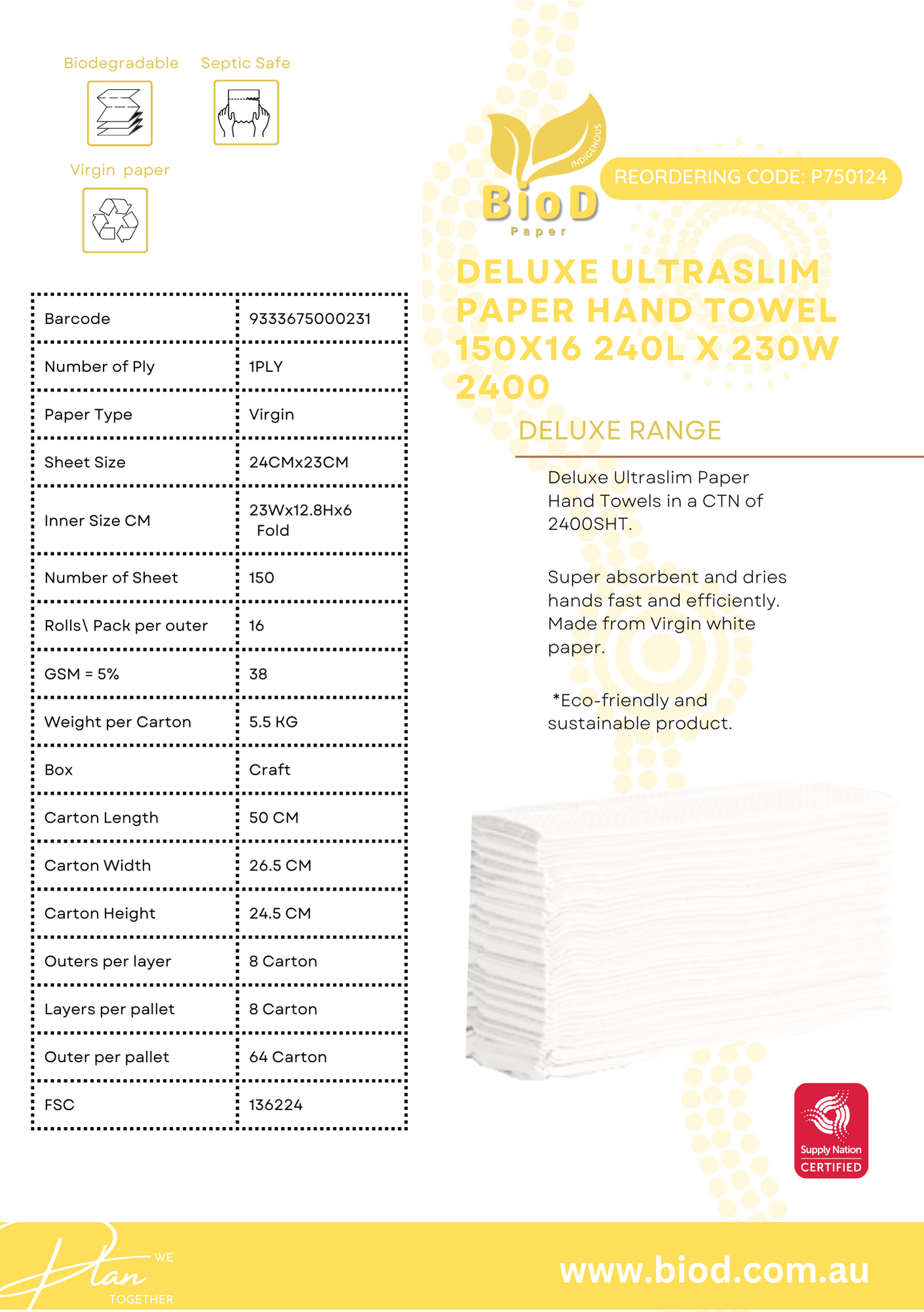 (INDIGENOUS OWNED) BIOD-DELUXE ULTRASLIM PAPER HAND TOWEL 150X16 240L X 230W 2400