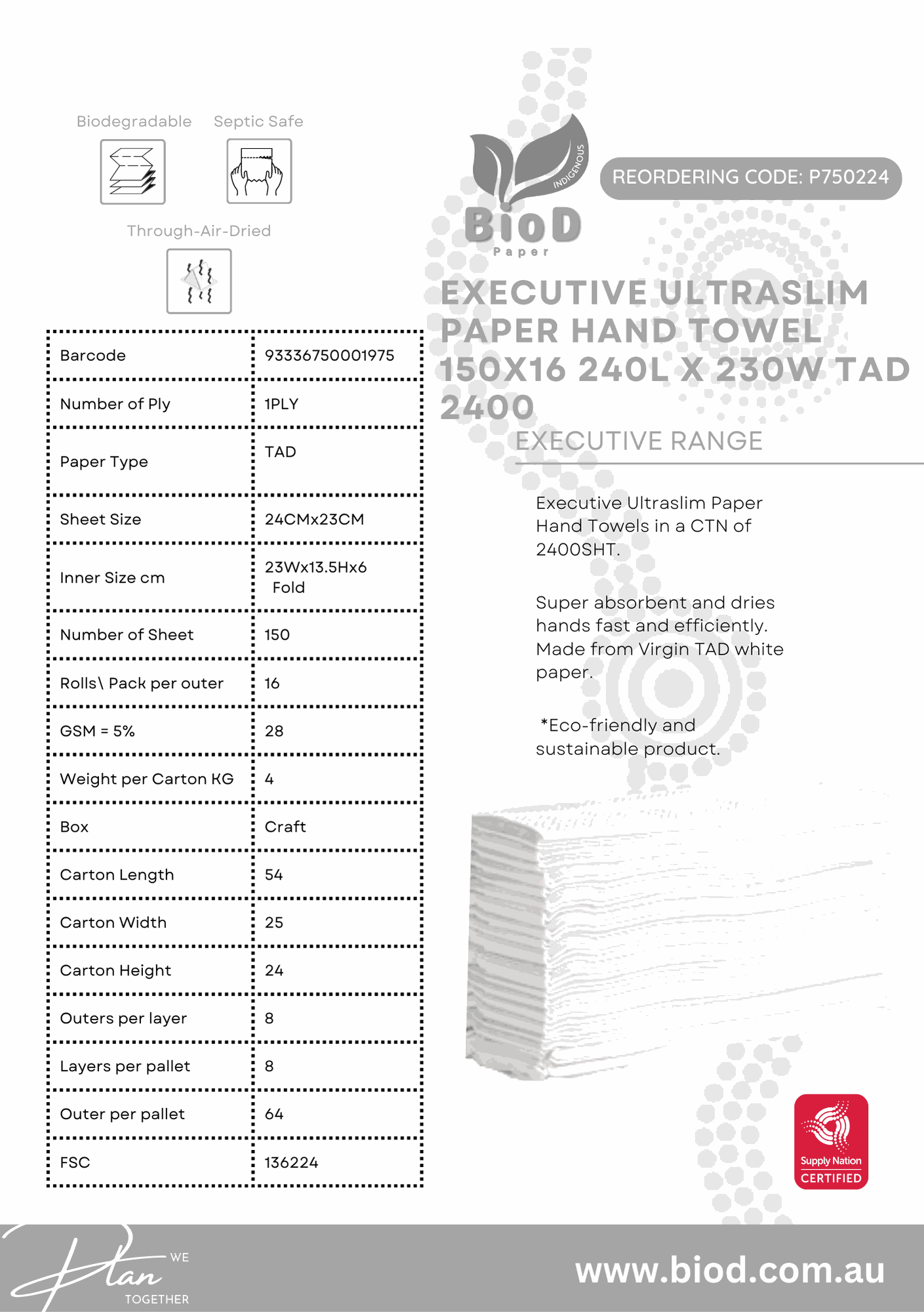 (INDIGENOUS OWNED) BIOD - EXECUTIVE ULTRASLIM PAPER HAND TOWEL 150X16 240L X 230W TAD 2400