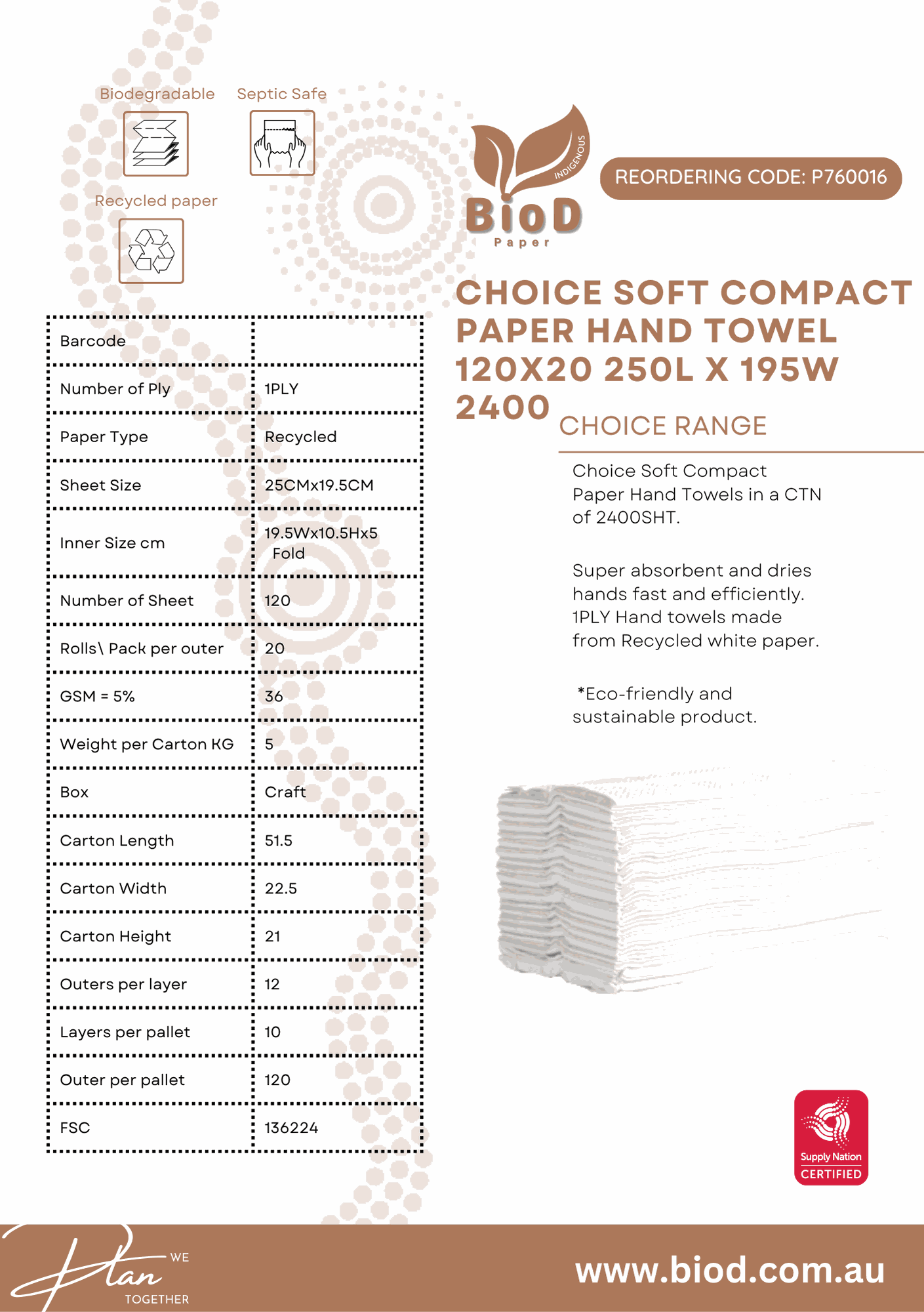 (INDIGENOUS OWNED) BIOD - CHOICE SOFT COMPACT PAPER HAND TOWEL 120X20 250L X 195W 2400