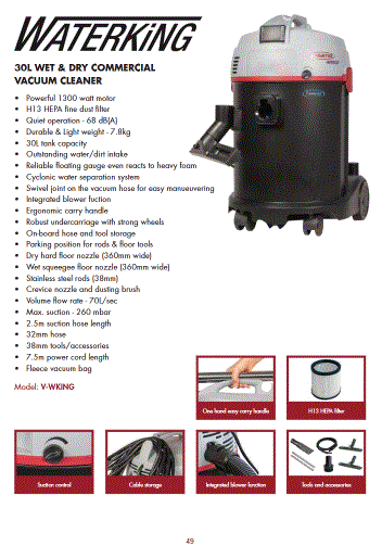 This wet and dry vacuum with H13 HEPA filtration is ideal for commercial cleaners. The Waterking displays outstanding performance on a range of surfaces and suction power can be adapted to any kind of flooring. With the integrated blower function, filters and work benches can be blown clean, or wet surfaces dried quickly.